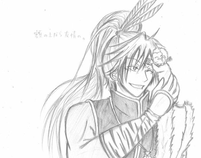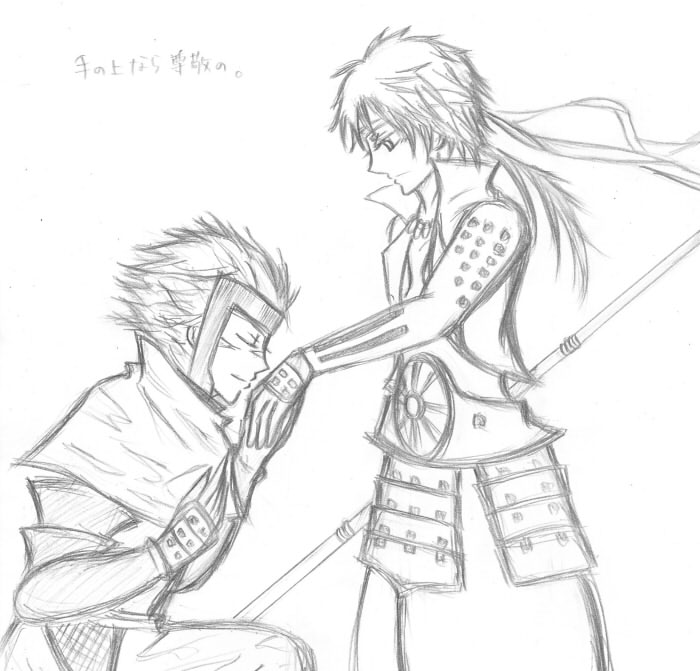 この前のチャットのちゅう話に萌えたのでジャックさんが言ってた詩を使わせてもらってどこまでできるかやってみる。でもちゅうとか今まで描いたことない。orz全部ちゃんと描きたかったけど今ちょっと体力ゲージ赤いから気に入ったヤツができればペン入れと色塗りやろう。最初は幸と佐助。尊敬ならお館様と幸でもよかったけど手の甲ならやっぱ幸と佐助だと思うんだ。でもこのお題最後の方激難だよな。笑))